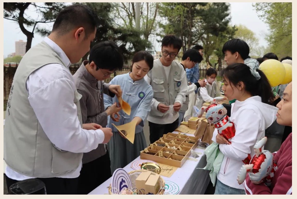 结合专业特色在专业教师的指导下,精心设计了以道地药材劳动成果为原材料的中药香囊制作及中药代茶饮品鉴活动项目,同时,现场师生共同用贴纸完成了“药”字启耕实践绘记。