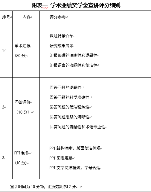 公开答辩前,从各系选派专家组成评审组,选出的专家名下应没有学生申报当年的学术业绩奖学金,并采取现场实名打分进行考核,答辩考核重点参看《学术业绩奖学金宣讲评分细则》(附表一)。
