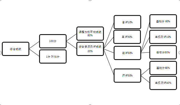 综合测评分数:满分100分。课程加权平均成绩=80分。综合素质测评成绩=自评+互评+组评+师评=20分。附加分:满分1.000分。