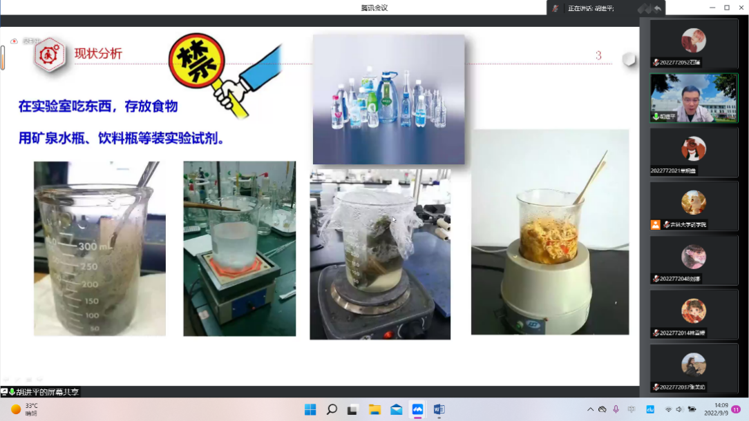 随后胡老师对实验室的现状进行了分析,并强调了完善的实验室管理制度、良好的实验室安全习惯的重要性,还讲解了实验室设备的安全隐患与正确使用方法、正确的实验室着装、危化品的管理、试剂柜的管理、实验动物安全、锐器的操作方法等等。
