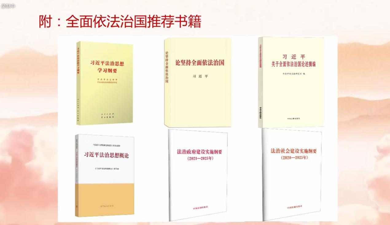 本次报告陈樱丹博士为我们详尽地讲述了习近平法治思想的形成和发展,深刻回答了新时代为什么实行全面依法治国、怎样实行全面依法治国等一系列重大问题,强调从我国革命、建设、改革实践中探索适合自己的法治道路,提出全面依法治国的基本框架和总体布局。习近平法治思想的核心可以概括为“十一个坚持”,其重大意义在于:是顺应实现中华民族伟大复兴时代要求应用而生的重大理论成果;是马克思主义法制理论中国化的最新成果;是习近平新时代中国特色社会主义思想的重要组成部分;是全面依法治国的根本遵循和行动指南。习近平法治思想在伟大实践中全面发展,在时代进程中成熟完善,在应对风险挑战中指引法治中国建设开创新局面,也必将引领全面依法治国实践在新发展阶段实现更大发展,不断迈向新的更高境界。最后陈博士向同学们推荐了六本全面依法治国方面的书籍,便于同学们能够更加深刻的理解习近平法治思想的重大意义。