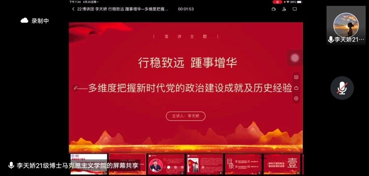 马克思主义学院2021级博士研究生李天娇主讲的以《多维度把握新时代党的政治建设成就及历史经验》为主题的相关报告。