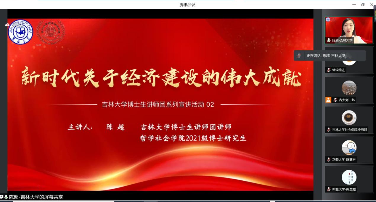 哲学社会学院2021级博士研究生陈超博士以《新时代关于经济建设的伟大成就》为题,向我们系列讲述了党在经济建设方面的历史性成就以及新时代中国经济新发展的新成果。