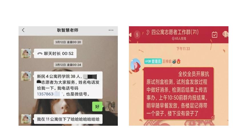 在疫情最严峻的爆发初期,王梓俞老师和耿智慧老师,于长春封控的第一个晚上,仅带着几件换洗衣物和最基础的生活用品,住进了学生公寓一张刚收拾的小小床位上,开始了她们长达40多天的坚守。初期防疫工作繁重,人手调配和物资不够充足,老师们熬夜工作已经成了常态,晚上11点,通知群里经常能看到她们布置工作的身影,清晨,她们又是第一个起床,给同学们消毒物资,分发餐食。从晨光破晓到华灯初上,老师一方小小的身影,就一直立在宿舍出入的安全口,似灯塔,似风向标,似万万千千抗疫人员的一方细细缩影,守护着我们的安全。在老师的积极调配下,我们从一开始的饮食单调,变得香肠、面包、饮品各种口味俱全,从一开始的用品匮乏,变得每个宿舍防疫物资、生活用品、药品齐全;心情也从一开始的恐慌无措,渐渐变得安之若素,老师就是春的播种者,使我们心田绿草如茵,繁花似锦。