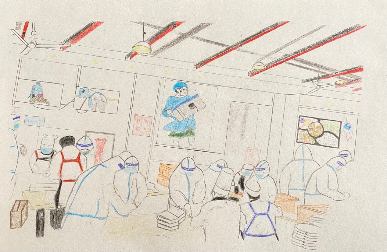的一句推送“孩子们,我们一定把饭供上”令人破防。工作人员和身穿防护服的人员正在打包饭菜,三荤一素,每天三顿,还有额外的零食和水果,我们在这里被爱和关怀。