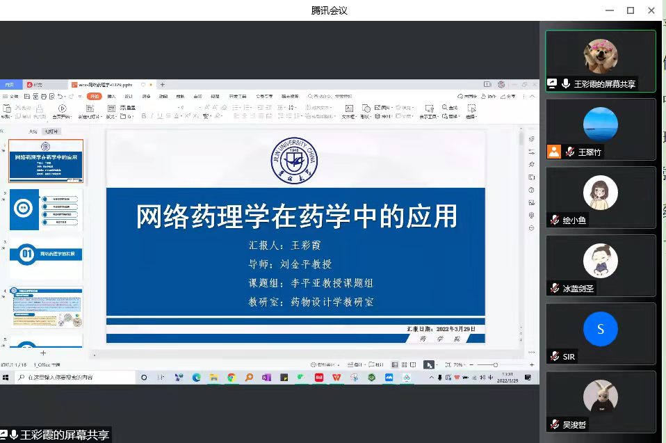 线上报告由药物设计教研室的王翠竹老师主持,报告人是我院2020硕士研究生王彩霞同学。王彩霞同学自从本科毕设以来,就从事网络药理学相关研究,其毕设论文《基于网络药理学的Rg3配伍芹菜素抗癌作用机制分析》获得了探花