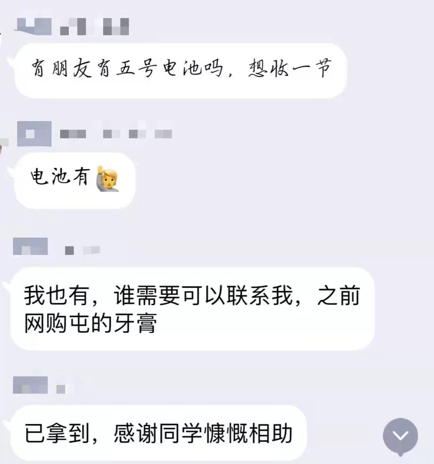 学生干部、党员也都积极参加到志愿工作中,搬运物资、发放餐水、协助核酸检测工作......男生们主动抬重物,女生们则负责清点分发。每当餐车缓缓驶来,志愿者们各自就位,按楼层分餐,工作早已做得熟练而有序。不管是学院老师,还是学生志愿者,不管做着什么工作,都在朝着防控疫情的中心点发力施策。在由志愿者们保障着日常基本生活的同时,同学们也没有消极怠工,在寝室自觉学习,看文献、开组会......尽管实验室的大门此刻不能向我们敞开,但在春天播种下努力的种子,定会在未来开花结果。在同学们自发组建的六公寓互助群中,一节电池、一管牙膏、几包零食......慷慨的分享互助,传递着的不仅是同学间的友谊与温暖,更是同处境面前彼此鼓励扶持的信心与安心。因为命运相连,所以心心相通。