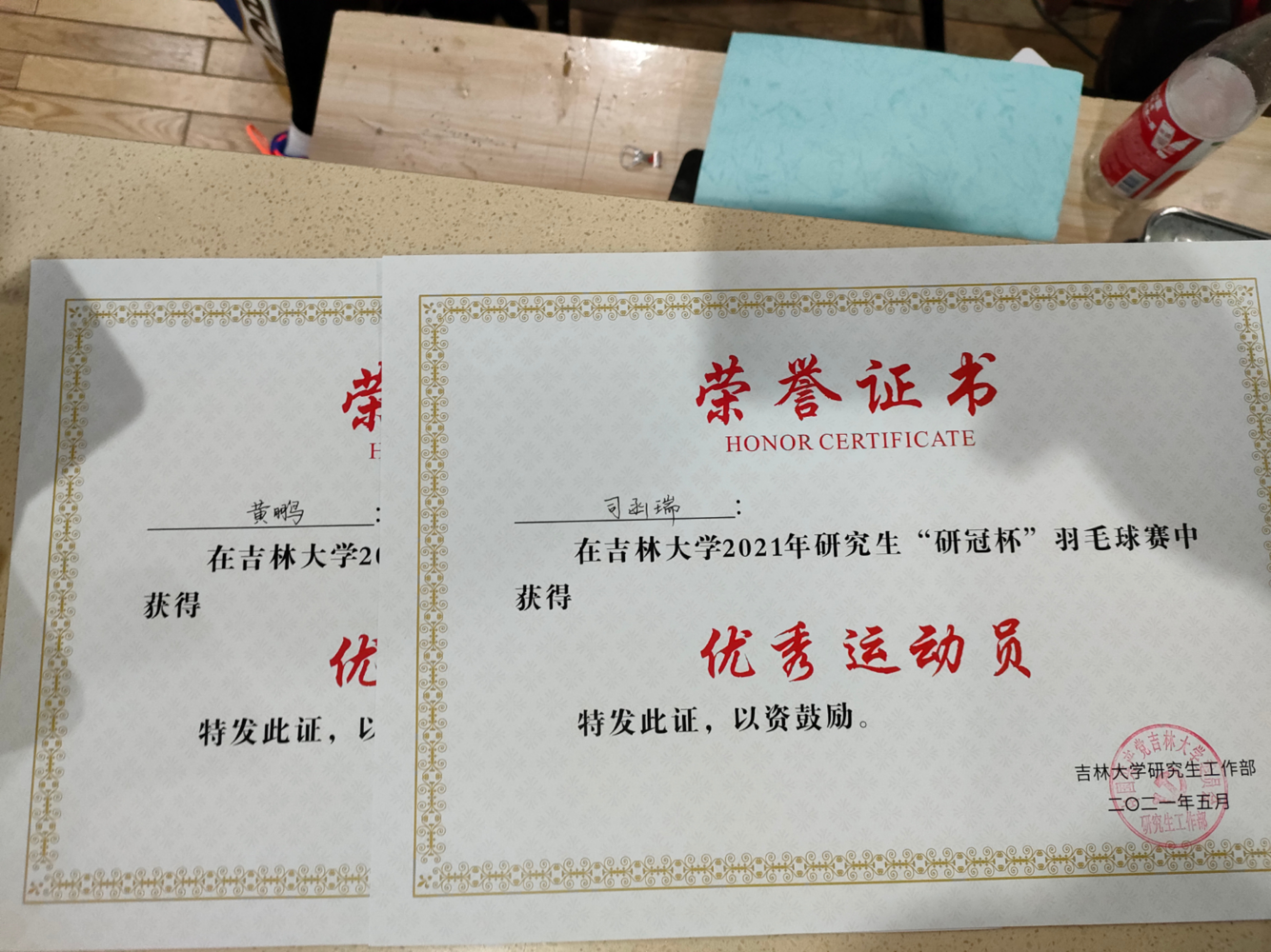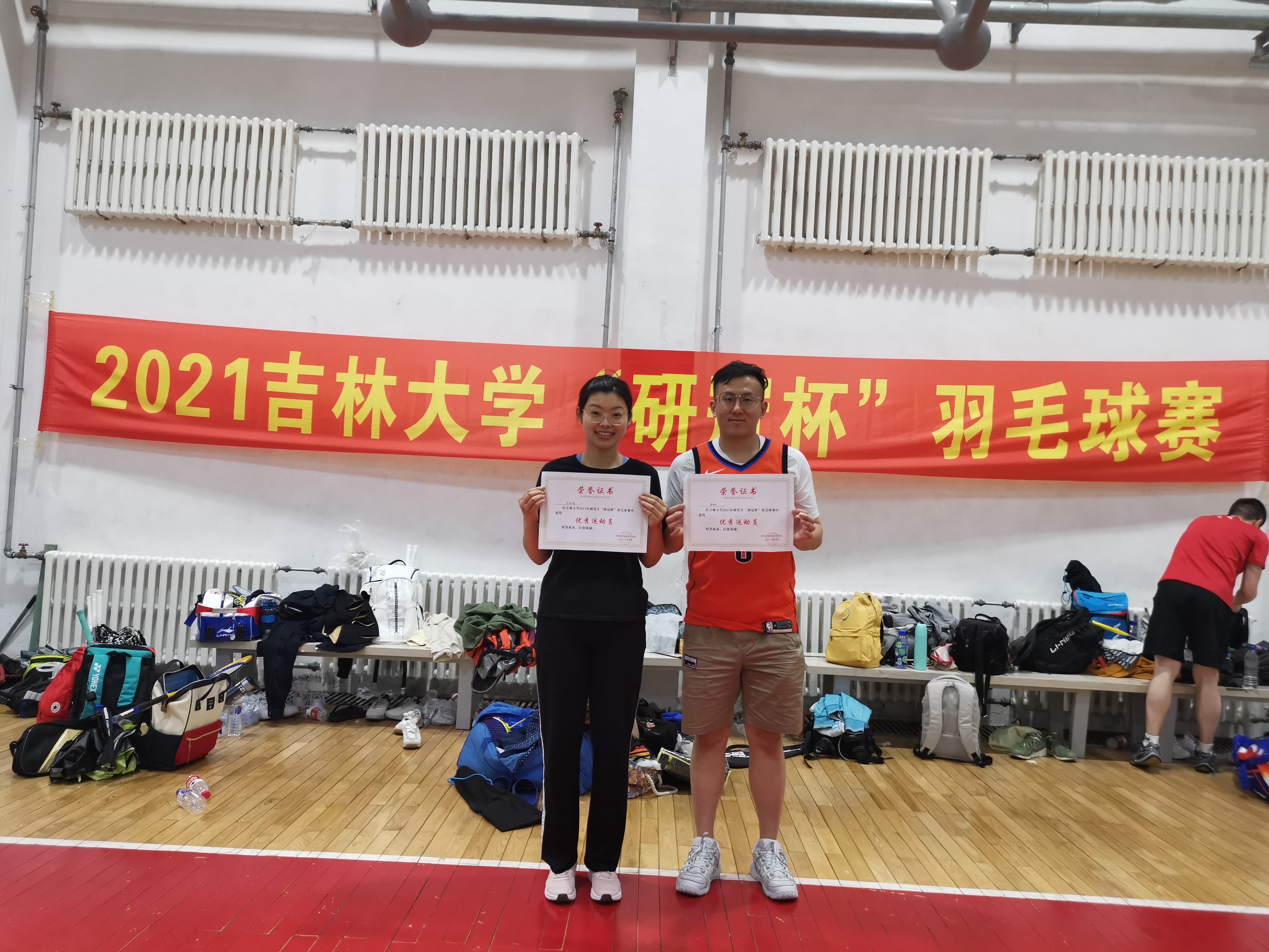 2021年研究生“研冠杯”羽毛球赛“优秀运动员”荣誉称号!为我院其他参赛选手鼓舞了士气,振奋了精神!男单选手方帅和刘俊彤同学,女单选手焦玉凤和陈小玲同学,混双选手史大臻、赖思含同学在赛场上尽情挥洒汗水,展示着令人炫目的技巧,把羽毛球的魅力完美地展现了出来!整个比赛中,大家欢声笑语,充满活力,展现了探花