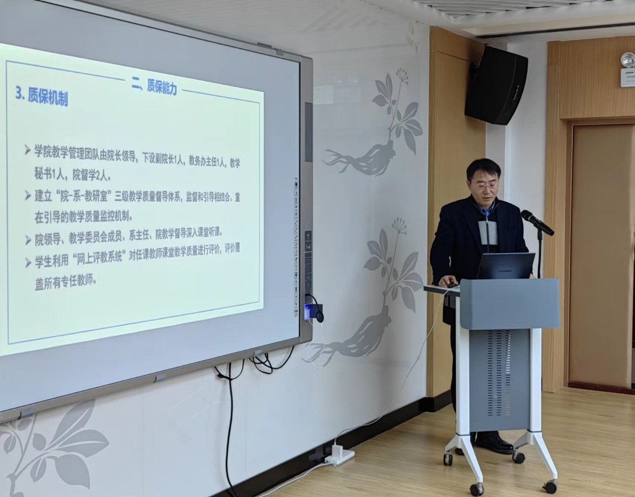 院长马杰教授就学院迎评情况、学院自评工作总结、存在问题及整改举措三方面进行了汇报。汇报内容体现了本科教育教学审核评估的指标体系和监测重点,包含了我院的师资队伍、专业建设、实践教学、课程建设、教学改革、学生发展和就业指导情况等。马院长表示,学院优秀的师资队伍、丰富的教学资源、创新的培养方式和成熟的教学质量保障体系是学院本科人才培养质量持续提升的重要根基。未来,学院将继续深化本科教育教学改革,提升教育教学质量,积极培育标志性教育教学成果。专家组提问环节中,各位专家对学院的办学定位和质量文化建设提出了宝贵的意见和建议。