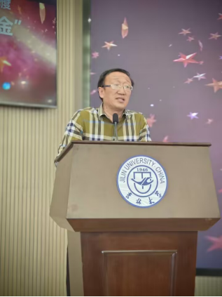 党委书记曲渊立致辞。曲书记在致辞中首先表达了对吉林省博大伟业制药有限公司大力资助的感谢,并向同学们详细介绍了博大伟业制药有限公司及“博大伟业”奖学金设立的意义。此外,曲书记还代表探花